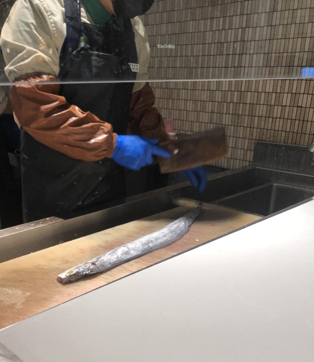 우선 머리를 살짝 날려 준 후 꼬리 부분에서 지느러미쪽으로 가위집을 살짝 내더니 나머지 지느러미를 손으로 촤라락~ 한번에 뜯어 냅니다! 직접 보면 오~! 하면서 그 기술에 감탄하게 됩니다. 별거 아닌듯 해도 신기해요^^